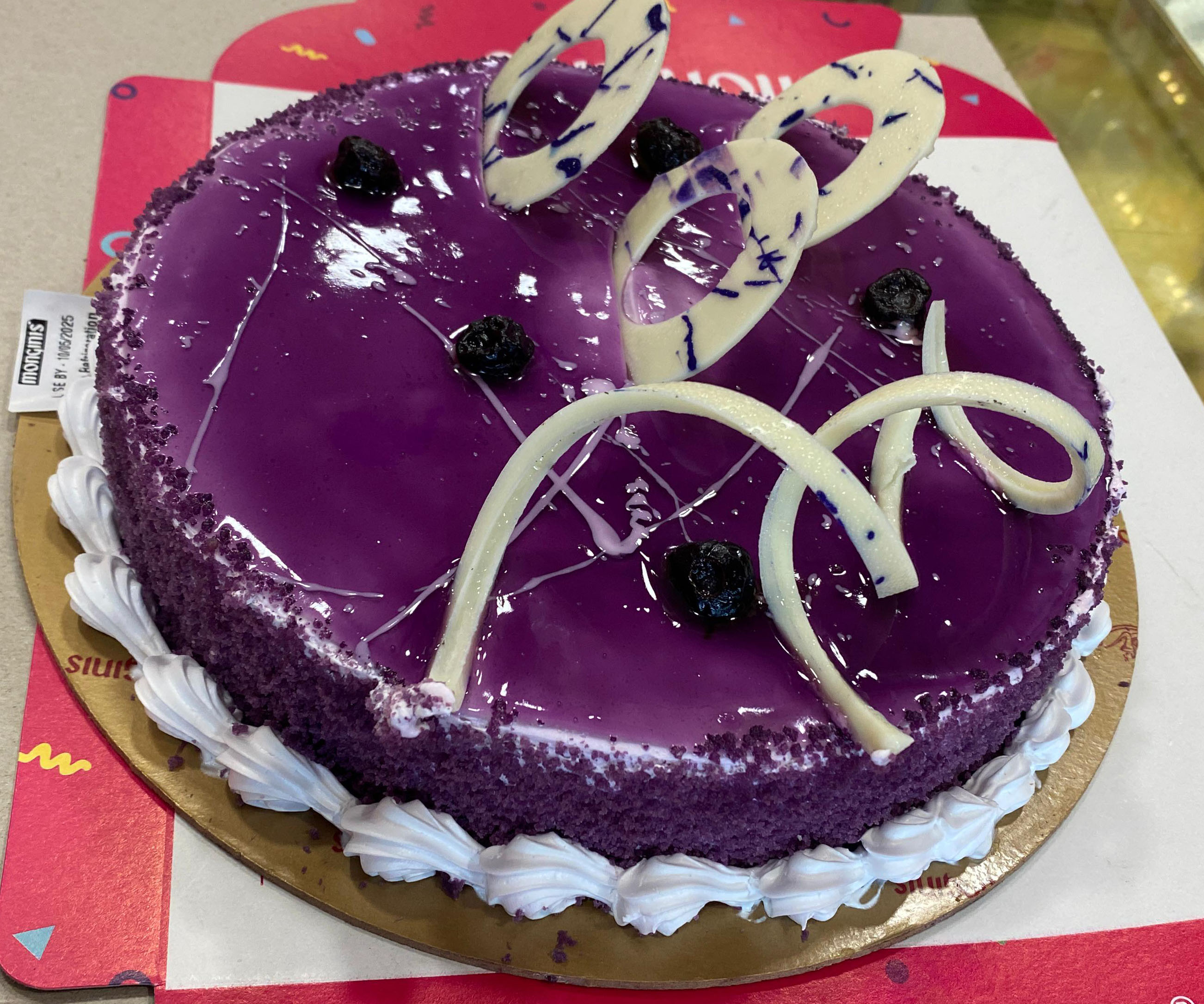 A delicious blueberry cake with moist sponge, creamy frosting and a generous layer of fresh blueberries.